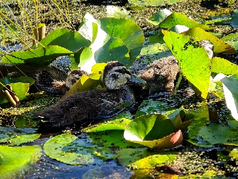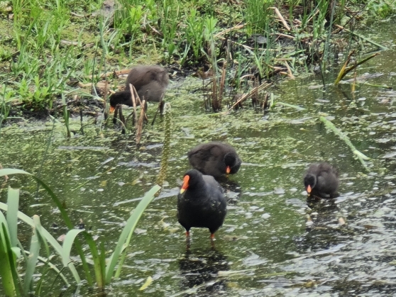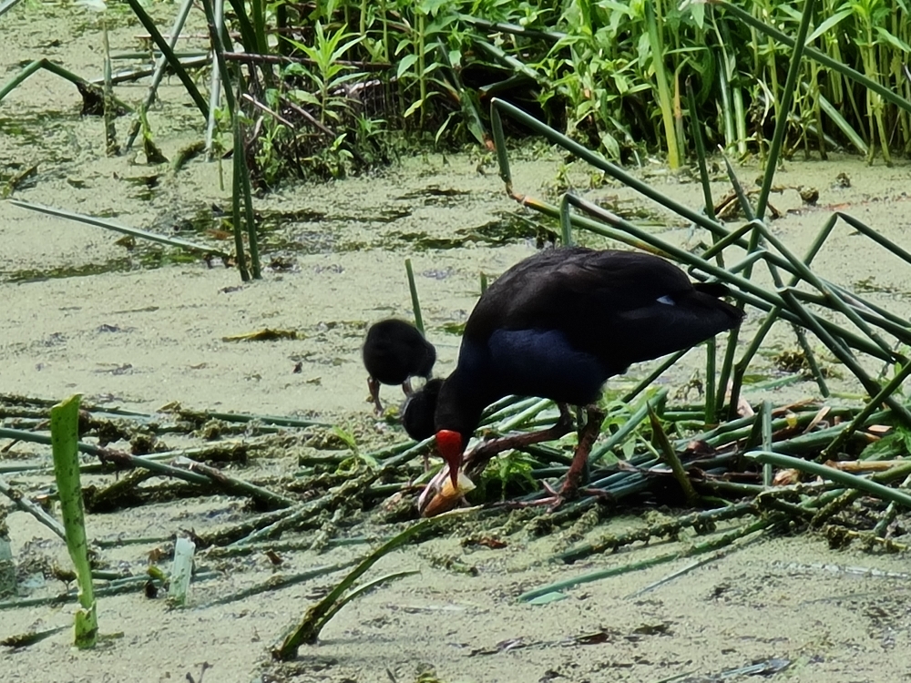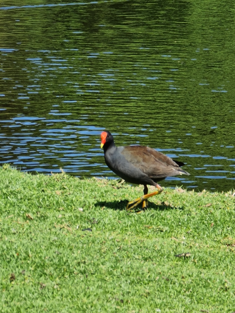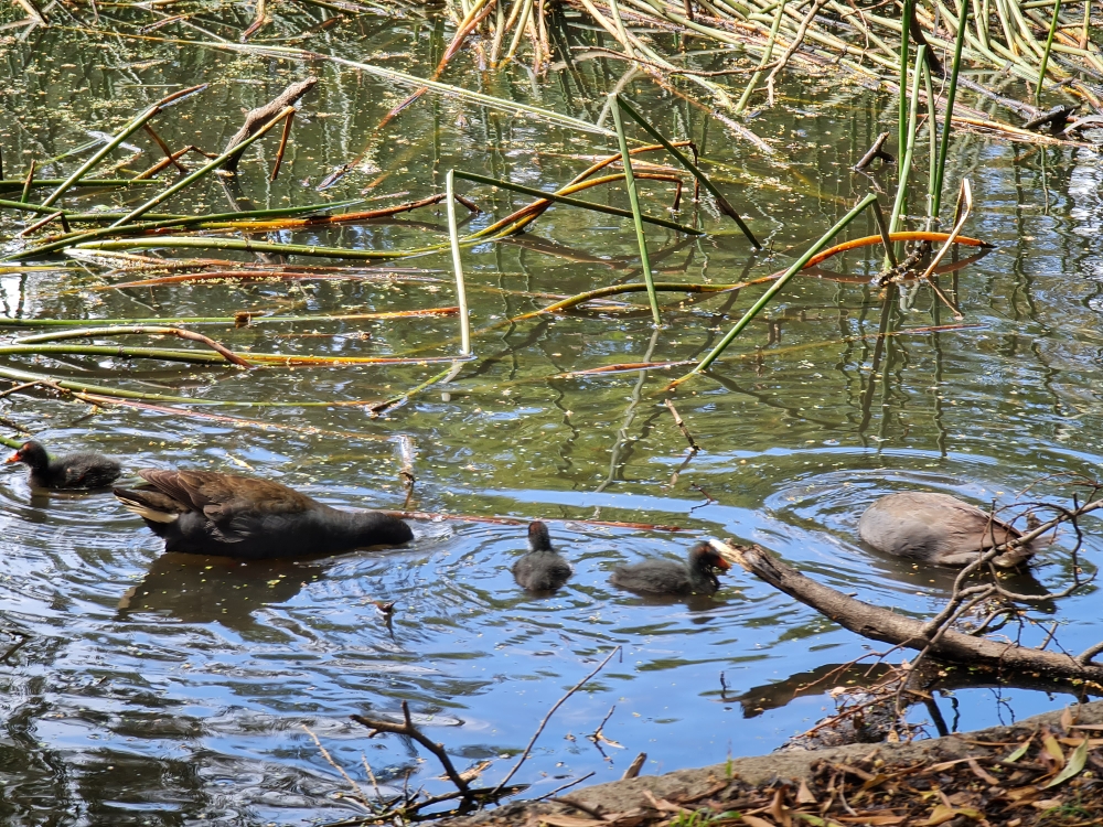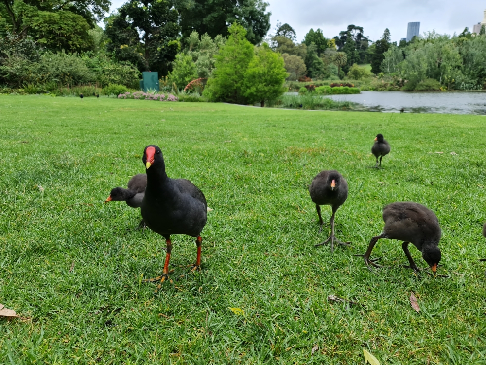 | 2020-10-17 - Royal Botanic Gardens Melbourne (Australie) - AndyandMeg Cacatoès à huppe jaune (3), Cacatoès nasique (1), Canard à crinière (20), Canard à sourcils (12), Cassican flûteur (6), Cormoran noir (2), Cormoran pie (1), Cygne noir (2), Foulque macroule (6), Gallinule sombre (12), Gralline pie (4), Grand Cormoran (3), Grand Réveilleur (2), Hirondelle messagère (2), Loriquet à tête bleue (24), Martin triste (30), Méliphage à gouttelettes (4), Méliphage à sourcils noirs (2), Méliphage barbe-rouge (12), Méliphage bruyant (12), Mouette argentée (12), Petit Corbeau (3), Pigeon biset (20), Séricorne à sourcils blancs (2), Talève sultane (12), Tourterelle tigrine (6) Warm sunny day after morning rain, gardens busy and birthday picnic lunch with Pegg. Swamphen with chicks that had just hatched, two separate nests with 4 chicks each. |