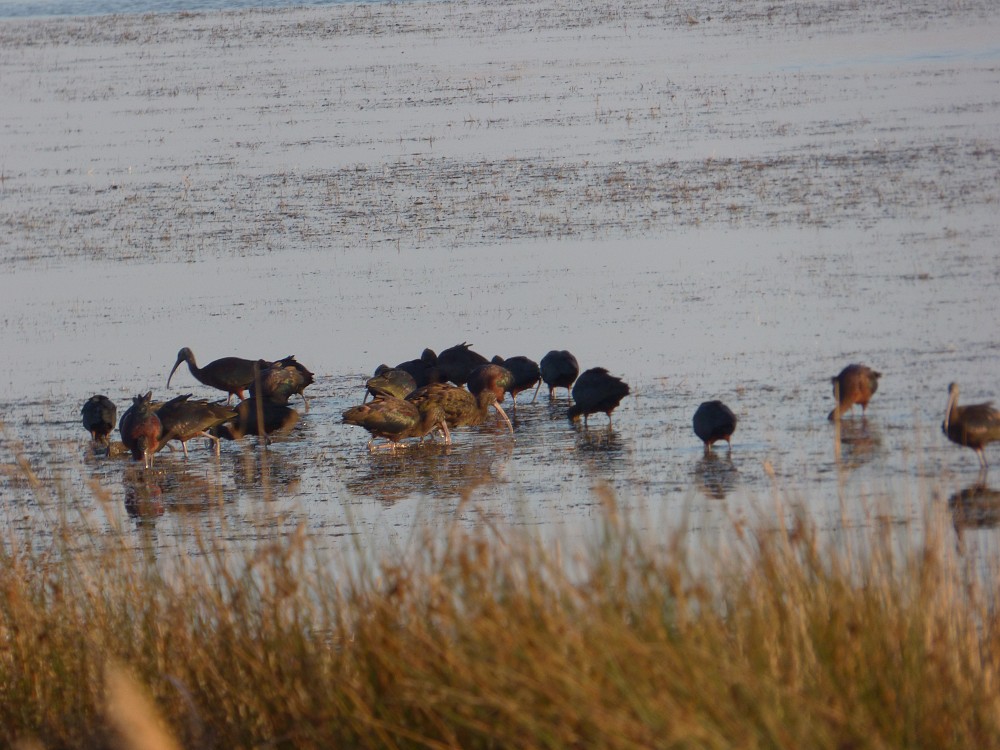 | 2014-12-28 - Mas d'Anglas (France) - Jaire, Manu, Phil Aigrette garzette (1), Bergeronnette grise (2), Busard des roseaux (2), Canard colvert (1), Chardonneret élégant (5), Cygne tuberculé (40), Épervier d'Europe (1), Flamant rose (20), Goéland leucophée (10), Grand Cormoran (10), Grande Aigrette (2), Héron cendré (2), Ibis falcinelle (150), Mouette rieuse (50), Pinson des arbres (10), Pipit farlouse (2), Pouillot véloce (2), Rougegorge familier (1), Tadorne de Belon (50), Tarier pâtre (2), Vanneau huppé (20) |