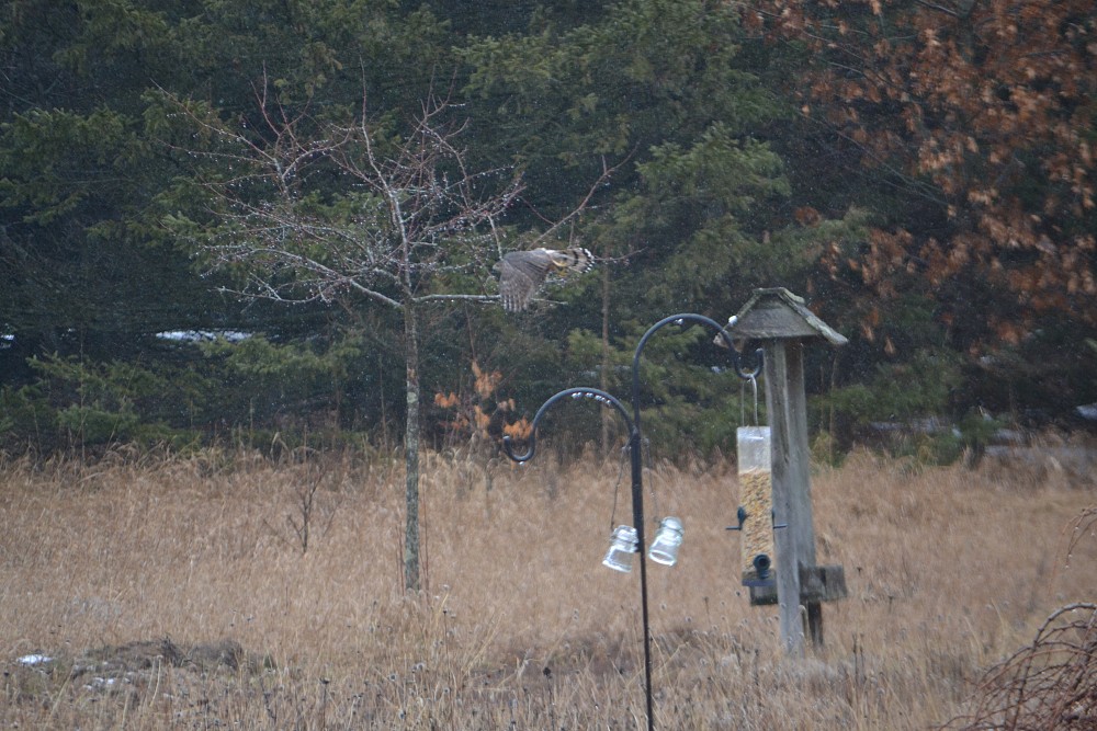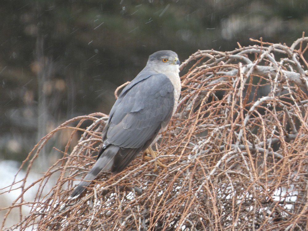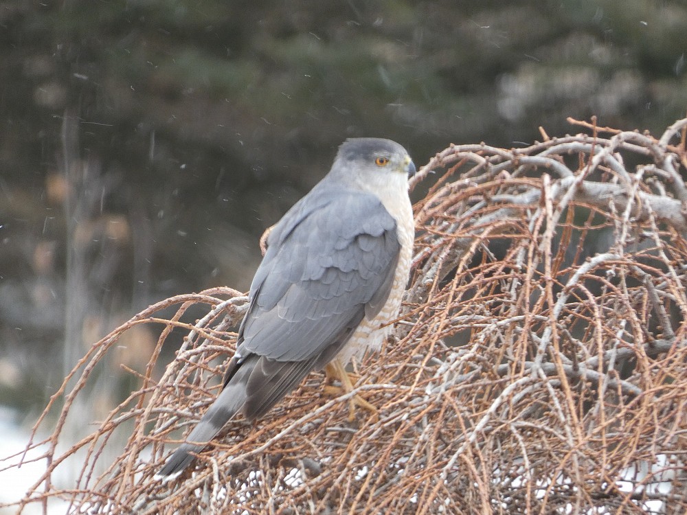 | 2023-03-18 - 7558 jills court, Washington County, Wisconsin, United States (NA) - tonyr Домовый воробей (15), Полосатый ястреб (1) Hawk chasing sparrows in weeping larch tree |