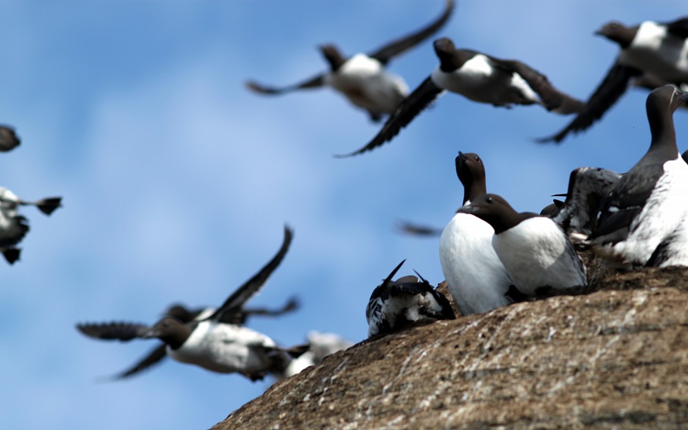 | 2015-05-20 - Hornoya (Norvège) - Jaire, Phil, Gilou, Manu Bergeronnette grise (2), Cormoran huppé (30), Eider à duvet (3), Grand Corbeau (1), Guillemot de Brünnich (20), Guillemot de Troïl (7000), Hirondelle rustique (3), Macareux moine (30), Mouette tridactyle (50), Petit Pingouin (1000), Pipit farlouse (7), Traquet motteux (2) Estimation du nombre de guillemot de Troïl et petit pingouin fournie par le guide. Le nombre de macareux et de guillemot de Brunich correspond au nombre d'individus que nous avons vu ce jour là.