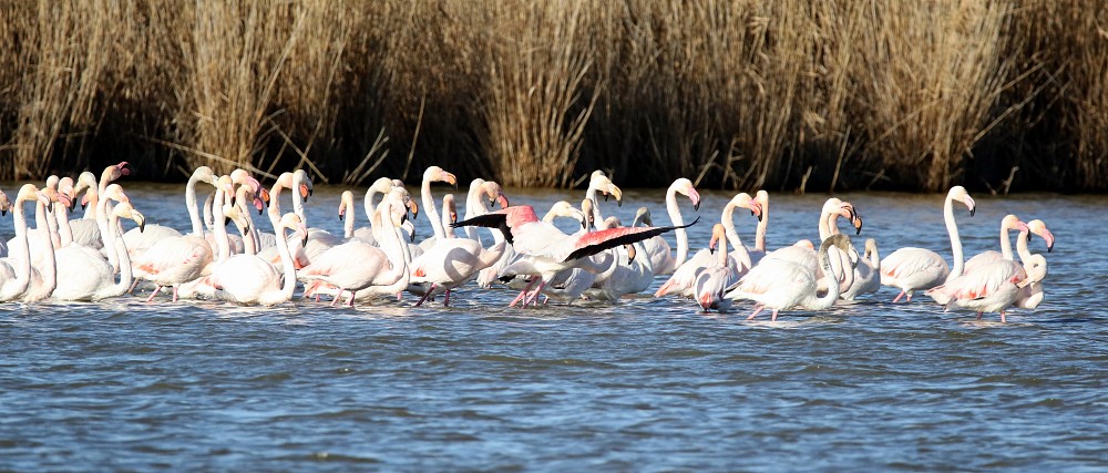 | 2021-02-17 - Réserve de Scamandre (France) - rdg Aigrette garzette (1), Busard des roseaux (3), Buse variable (2), Canard colvert (6), Cigogne blanche (4), Cormoran huppé (2), Cygne tuberculé (2), Étourneau sansonnet (1), Flamant rose (50), Foulque macroule (10), Gallinule poule-d'eau (3), Grèbe huppé (4), Grue cendrée (20), Héron cendré (3), Ibis falcinelle (1), Nette rousse (4), Rougegorge familier (1), Sarcelle d'hiver (6) |